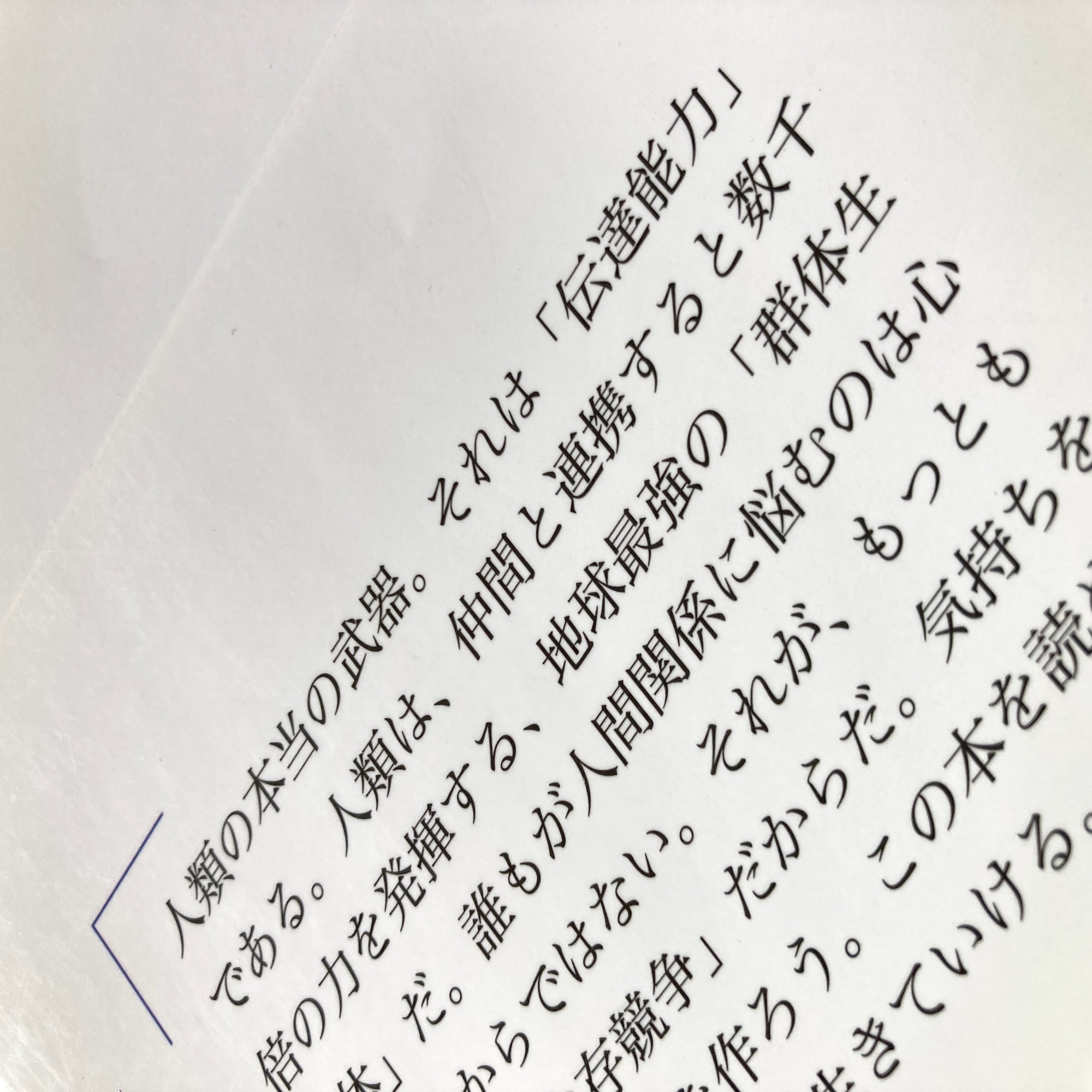 伝達能力こそが人がひとであること。そして人類が繁栄できたのはみんなで力を合わせてきたからという、いまの組織やビジネスと消費者でも必要なコラボーレーションを綴っていました。