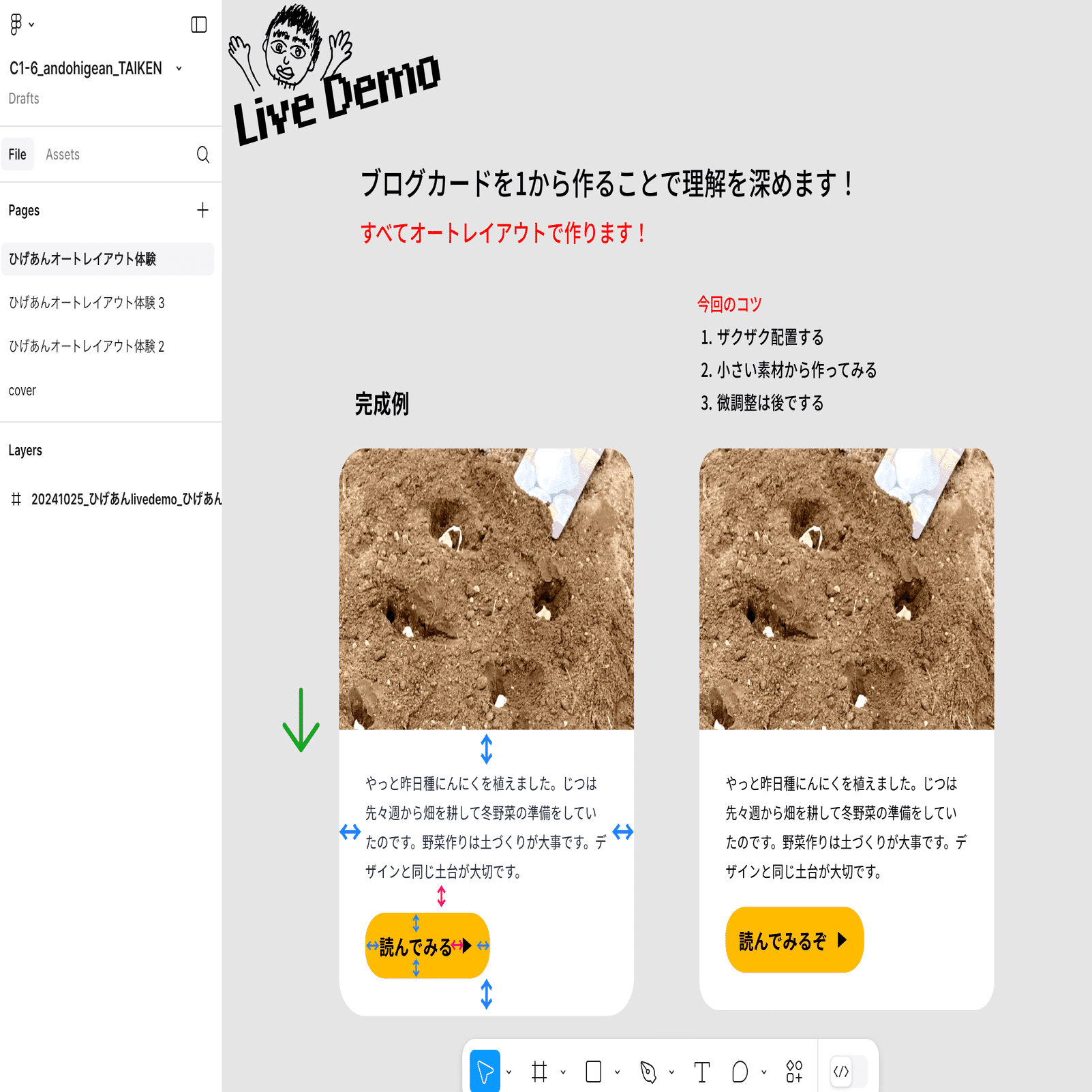 Live Demoでは、テキストと写真の素材から、ボタンやブログカードのデザインレイアウトをすべてオートレイアウトで実際にデザインするところをお見せしました。